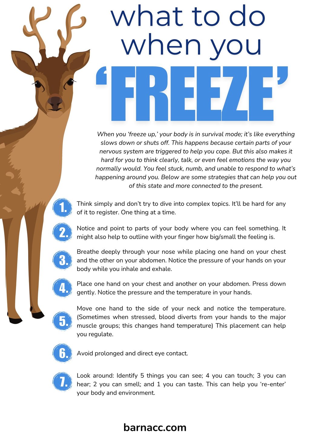 Clients who have been traumatised sometimes find themselves in situations where they feel unable to move, speak, or even think clearly. This 'freeze' response describes a state where the body is so overwhelmed that it essentially freezes in place. This survival mechanism is designed to protect us when situations feel too overwhelming or inescapable, and is often utilised when the fight-or-flight responses have or would fail. It's not a choice we make, but an instinct our body chooses in dire situations.