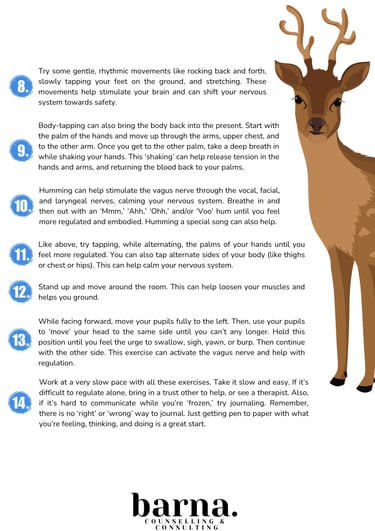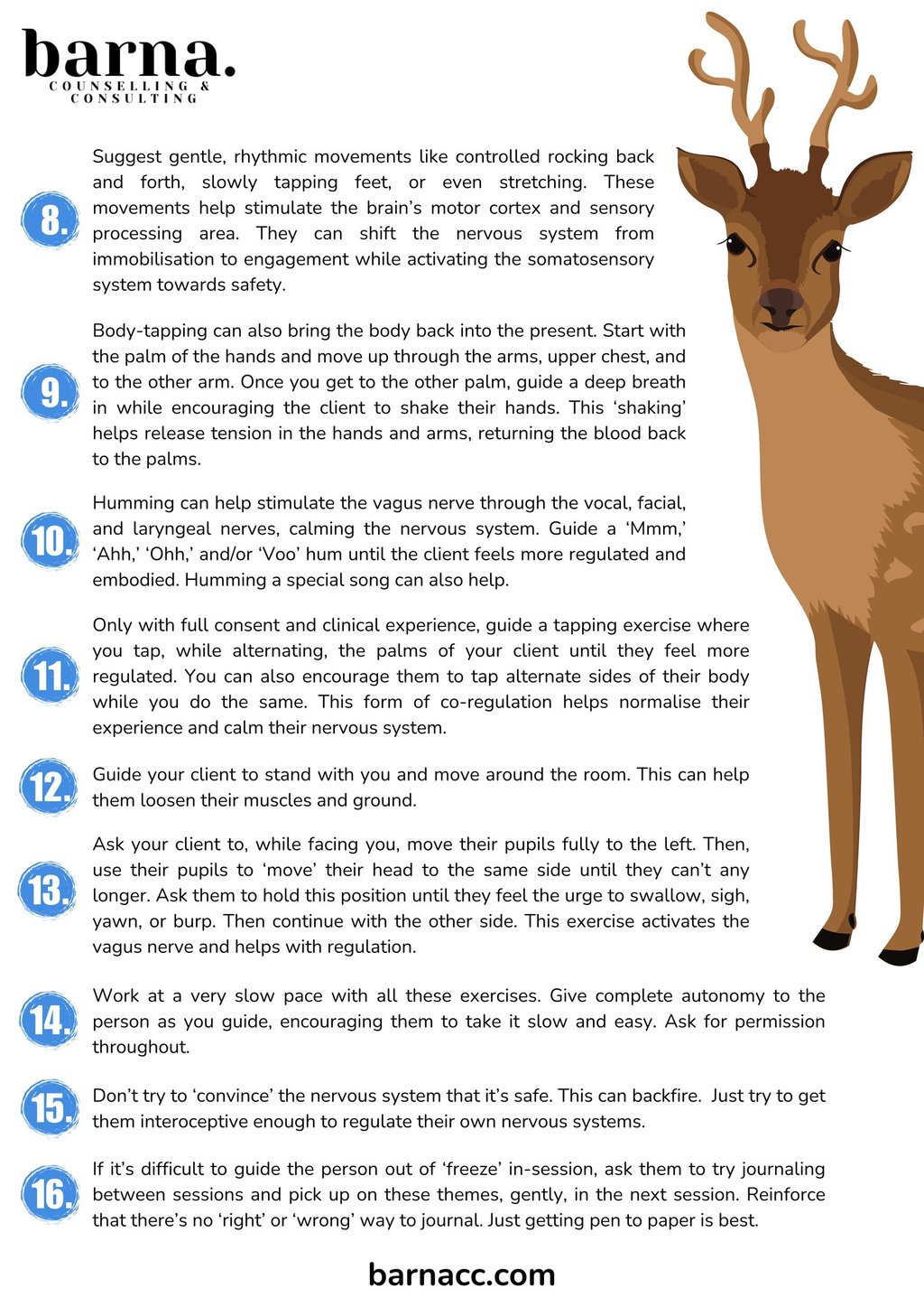 The infographics below are to be used by clinicians and clients alike (you can distinguish between which is which by the headings) to assist while in a 'frozen' state. The goal isn’t to 'fix' oneself by use of these strategies but to learn new ways to understand and work with your body’s responses. If you would like a PDF copy of either (or both), reach out and I'll send one through ASAP.