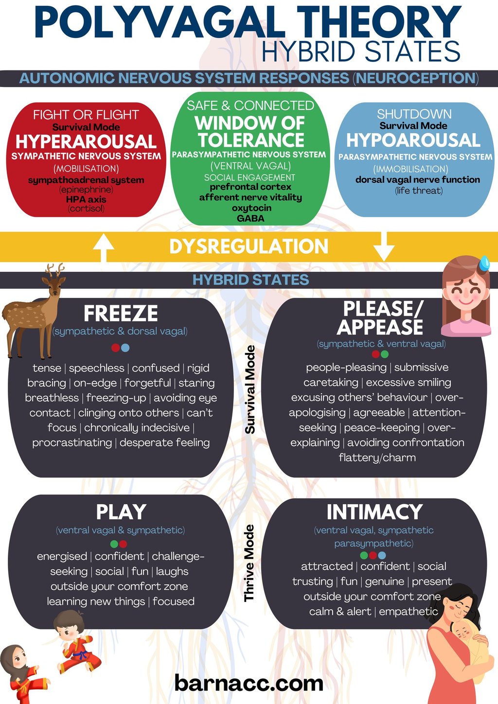 When more than one of these states collide, you're in what's called a 'hybrid state.' In these states, you might feel alive, connected, energised, and safe; or frozen, disconnected, disengaged, and terrified. Your nervous system navigates these states naturally—they are, you could say, a 'button' pressed for when it's needed most—but for many of us, stress, trauma, or past attachment issues can disrupt our ability to stay balanced.